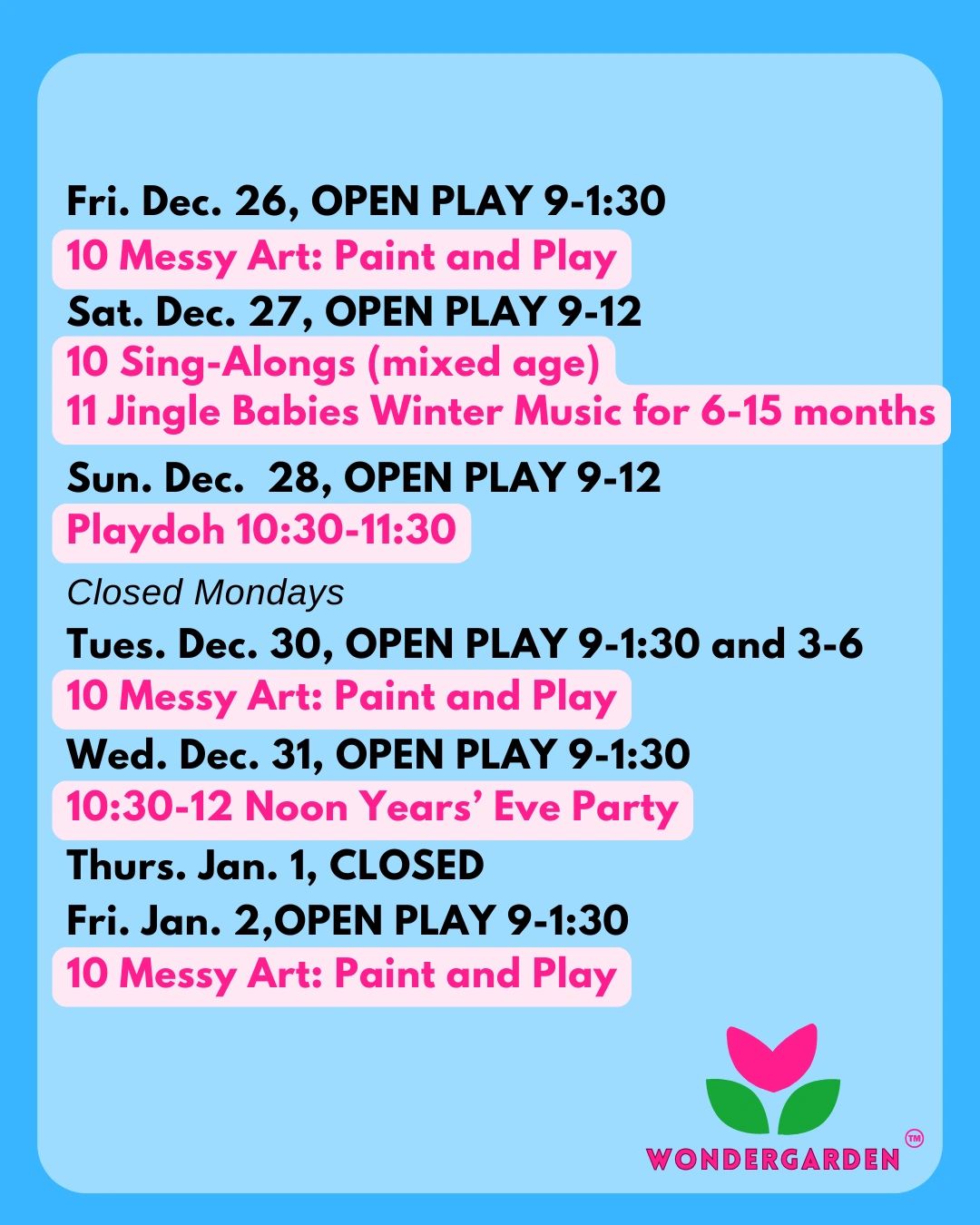 Welcome to Wondergarden™! We are a unique indoor play and party space for babies, toddlers, and children ages 0-6 years! Enjoy playtimes, parties, and kid classes! Grip socks are required for entry.