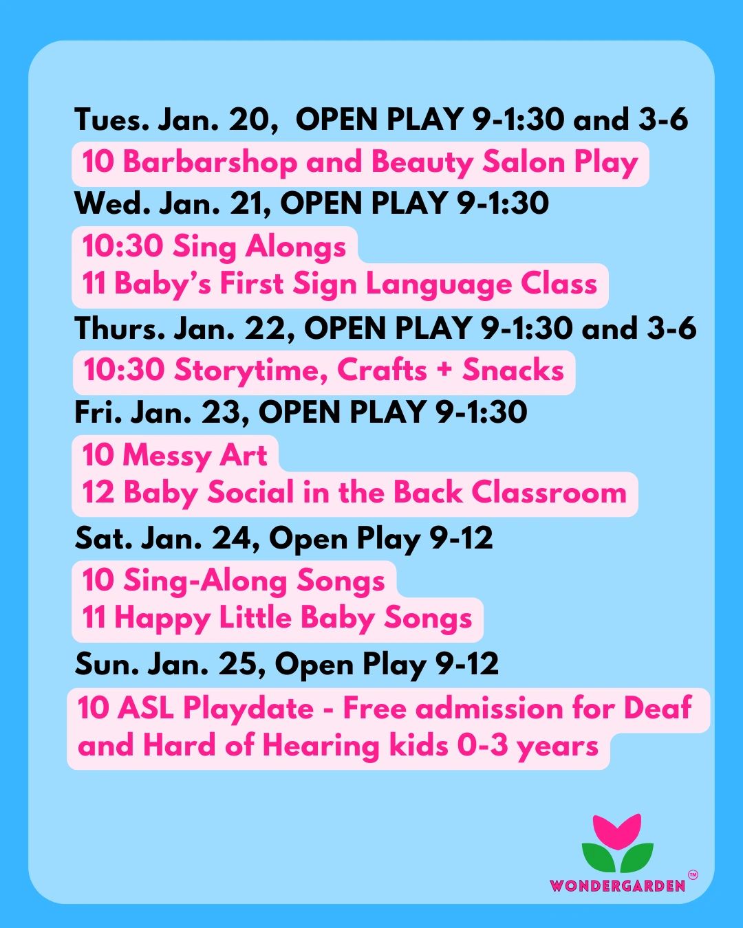 Welcome to Wondergarden™! We are a unique indoor play and party space for babies, toddlers, and children ages 0-6 years! Enjoy playtimes, parties, and kid classes! Grip socks are required for entry.